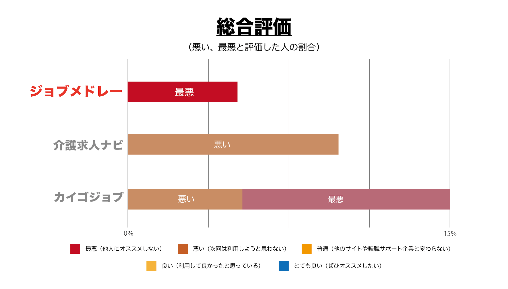 総合評価ではカイゴジョブの評価が1番低くジョブメドレーは1番目