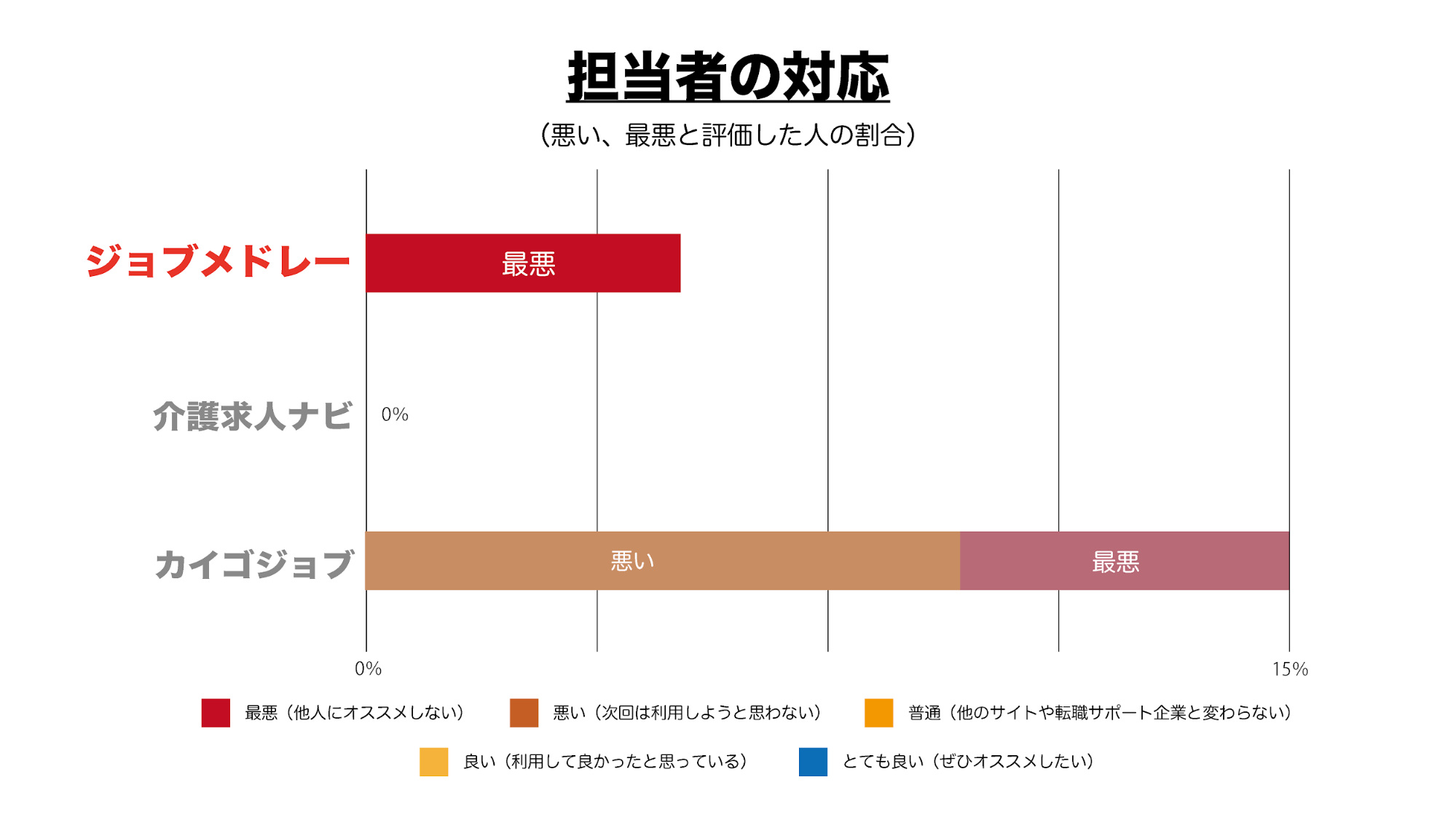 担当者の対応でもカイゴジョブ・介護求人ナビが1番低くジョブメドレーは2番目