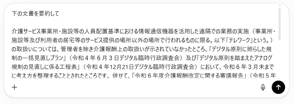 コピーしたテキストを入力欄に貼り付け、文書の前か後ろに一言添えます。この「一言」がプロンプトと呼ばれるAIへの指示文です。