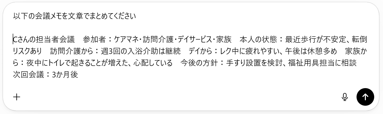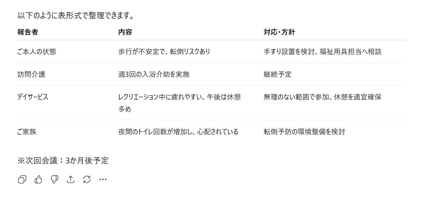 【Cさん担当者会議 まとめ】 ■ 本人の状態 ・歩行が不安定で転倒リスクあり ■ 訪問介護より ・週3回の入浴介助は継続 ■ デイサービスより ・レク中に疲れやすく、午後は休憩が多め ■ ご家族より ・夜中のトイレで目が覚めることが増えており、心配されている ■ 今後の方針 ・手すりの設置を検討。福祉用具担当者に相談する ■ 次回会議 ・3か月後 |