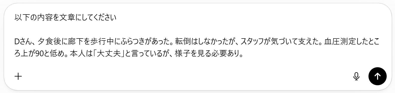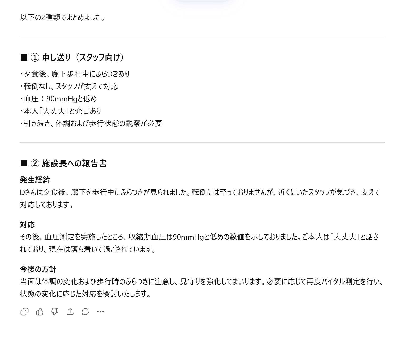 今日あった出来事や申し送り内容を一つ選んで、まず「スタッフ向け申し送りとして箇条書きで」と送ってみてください。次に「同じ内容をご家族向けの説明文として」と追加で送ってみましょう。