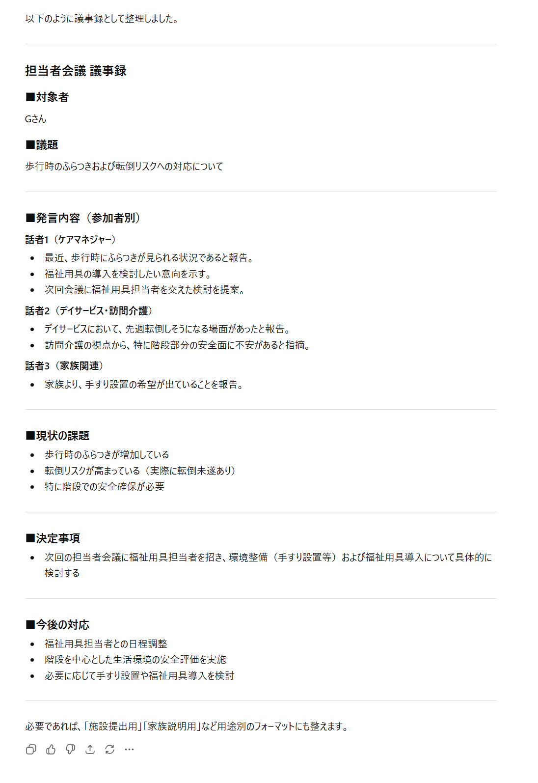 話者1:Gさんの件なんですが、最近歩くときにふらつきが出てきていて。 話者2:デイでも先週、転倒しそうになったことがありました。 話者3:家族さんからも手すりをつけたいって話が出ています。 話者1:ケアマネとしては福祉用具の導入を検討したいと思っていまして。 話者2:訪問介護としても階段のところが特に心配です。 話者1:では次回、福祉用具の担当者も交えて話し合いましょうか。 |