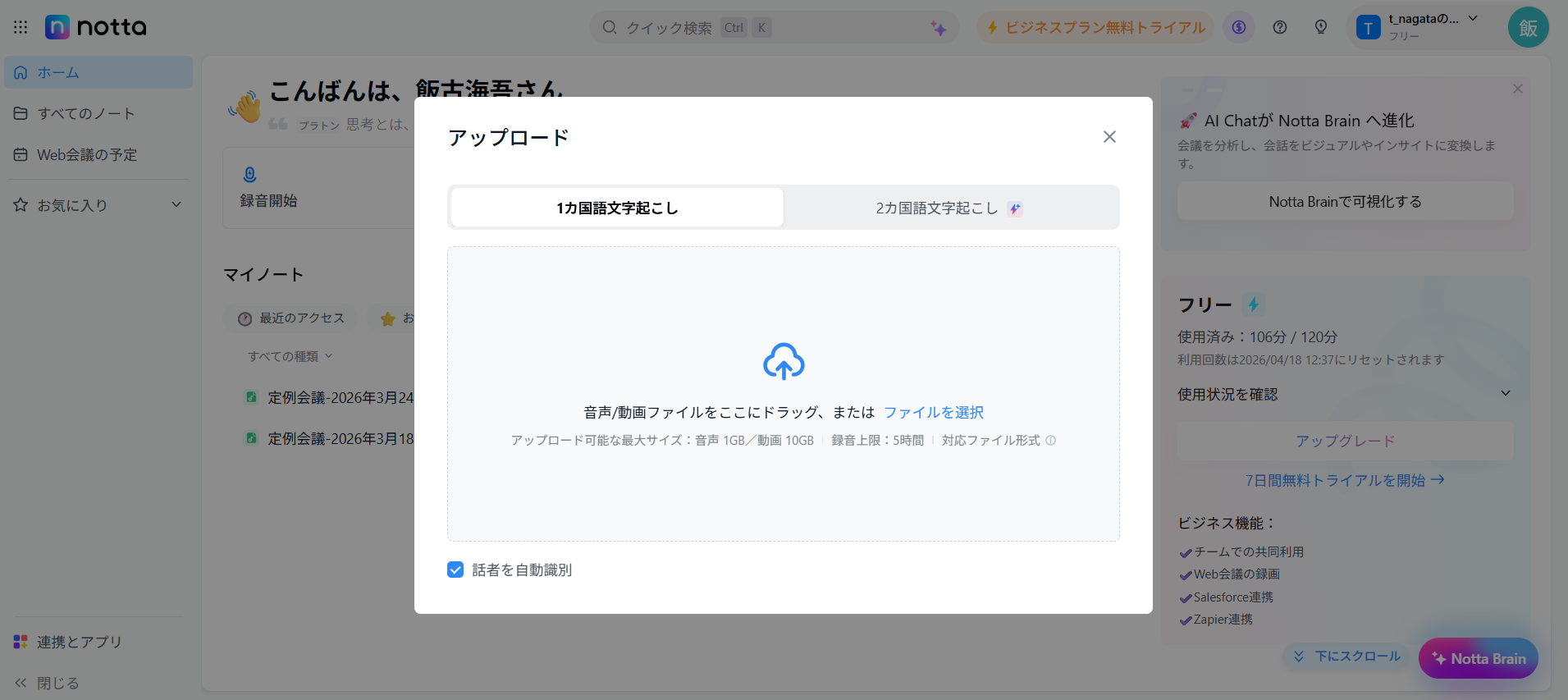 まずは無料で試せるNottaにアップロードして、文字起こしを体験しましょう。(https://www.notta.ai)