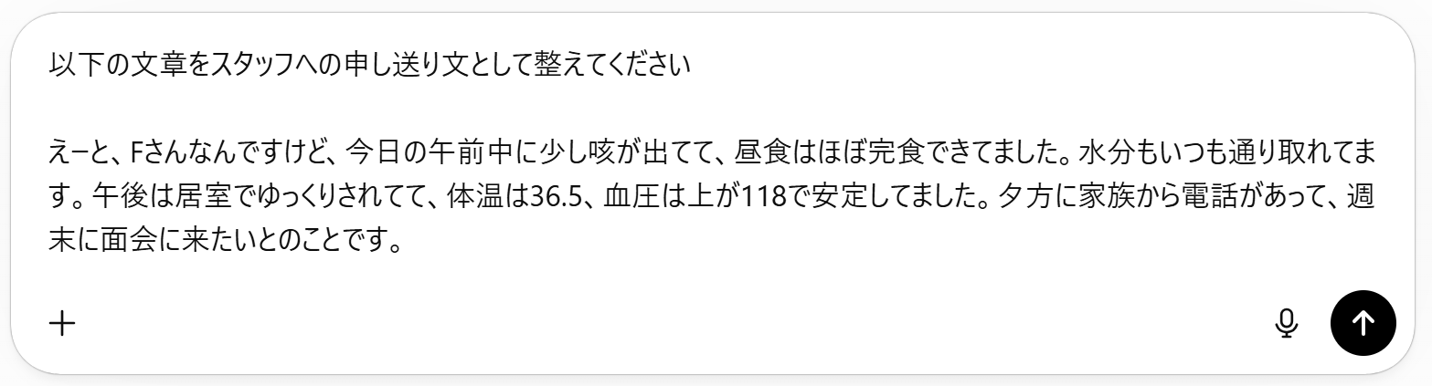 テキストになったら、ChatGPTに「申し送り記録として整えて」と一言添えて貼り付けるだけです。