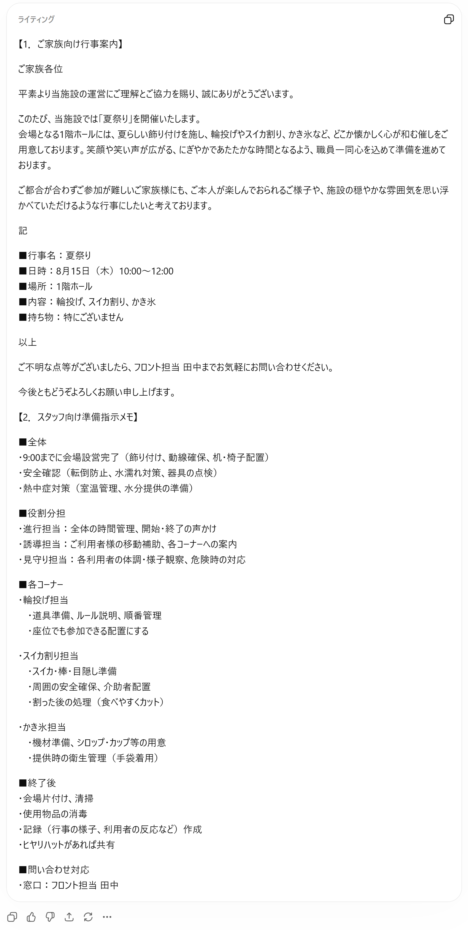 ご家族各位 平素より当施設の運営にご理解とご協力を賜り、誠にありがとうございます。 このたび、当施設では「夏祭り」を開催いたします。 ご都合が合わずご参加が難しいご家族様にも、当日のにぎやかな雰囲気やご本人の楽しそうなご様子を思い浮かべていただけるような、そんな行事にしたいと考えております。 記 ■行事名:夏祭り 以上 ご不明な点等がございましたら、フロント担当 田中までお気軽にお問い合わせください。 皆様にとっても、夏のひとときがやさしい思い出となりますように。 今後ともどうぞよろしくお願い申し上げます。 |