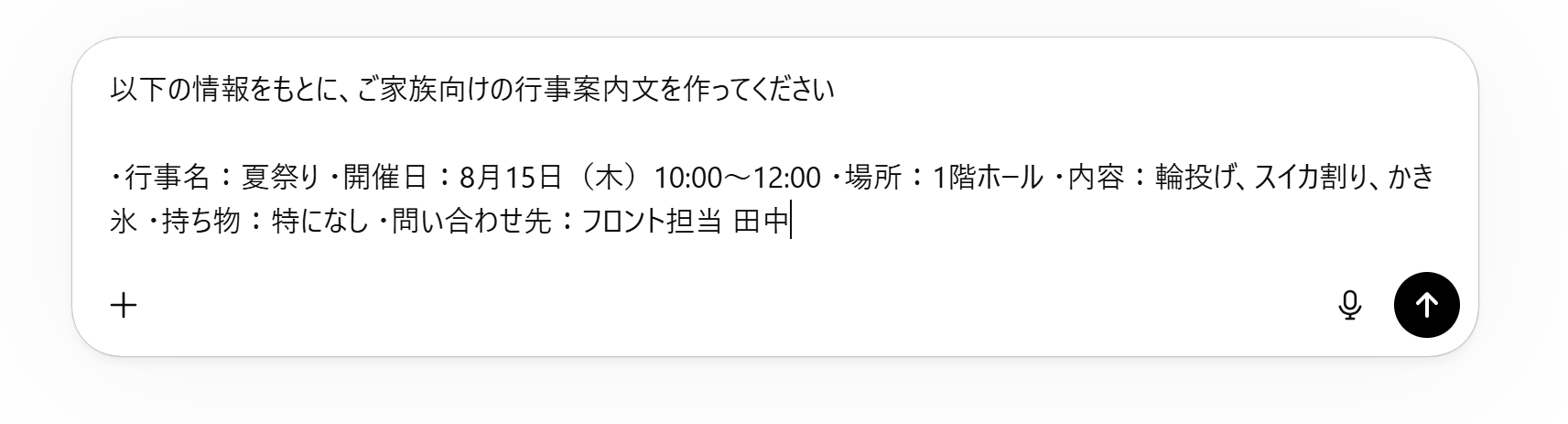 開催日・場所・内容などを箇条書きにして渡すだけで、ご家族向けのお知らせ文が完成します。紙のお便りやSNS投稿にもそのまま使えます。