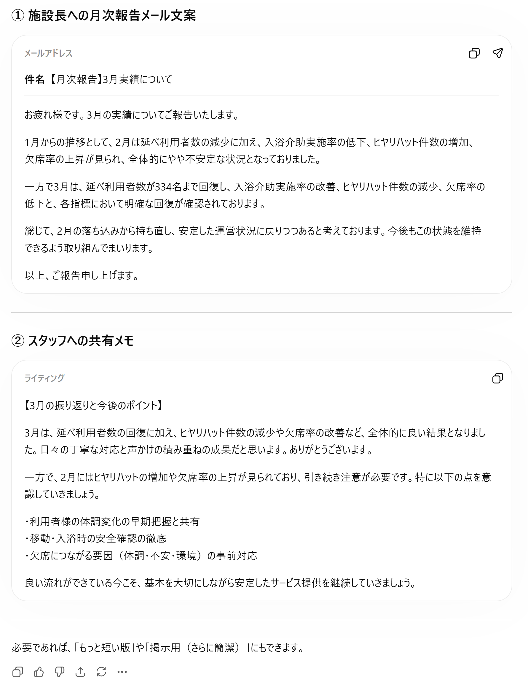 出力を確認して、必要なら「もう少し短く」「施設長向けに」など追加で指示します。