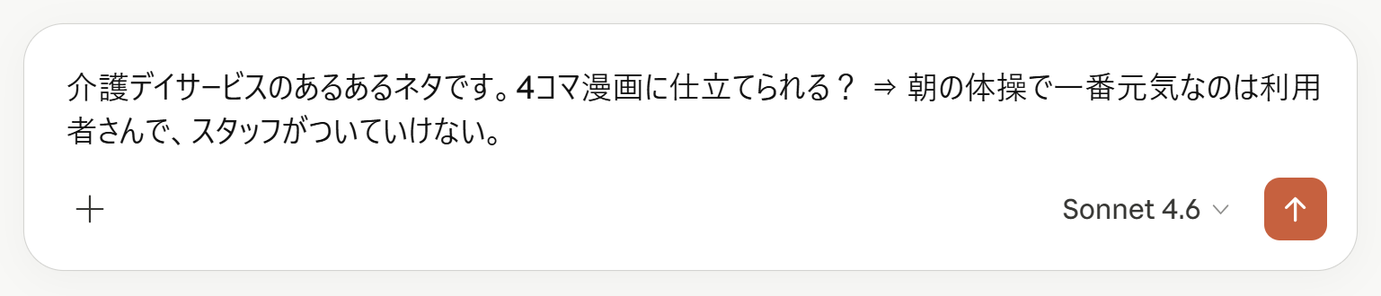今日の業務で「あるある」と感じた場面を一つ思い浮かべてください。それをそのまま一行書いて、ChatGPTに「介護デイサービスのあるあるネタです。4コマ漫画に仕立てられる? ⇒」に続けて送るだけです。