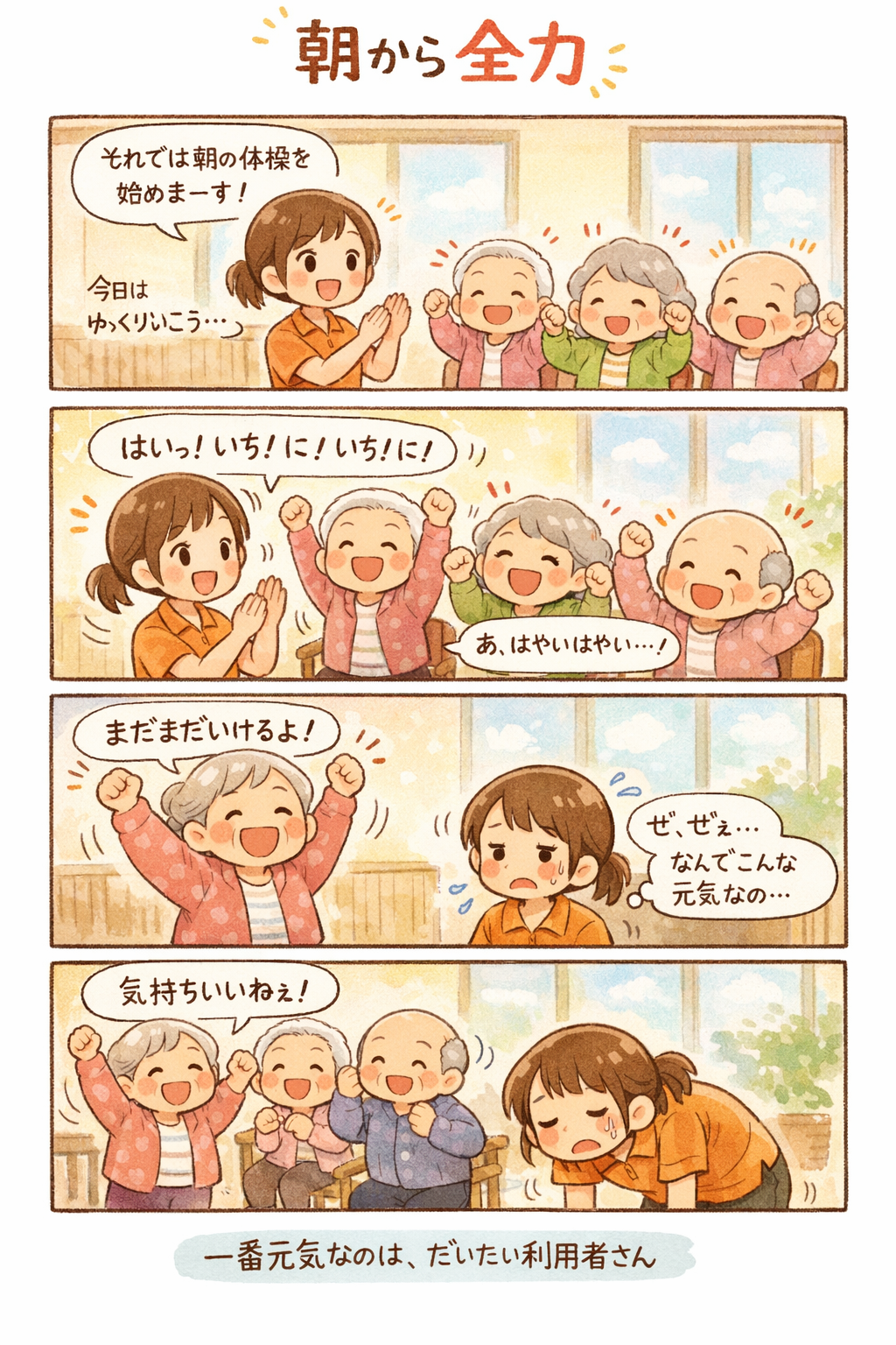 「介護デイサービスのあるあるネタです。4コマ漫画に仕立てられる? ⇒ 朝の体操で一番元気なのは利用者さんで、スタッフがついていけない。」
