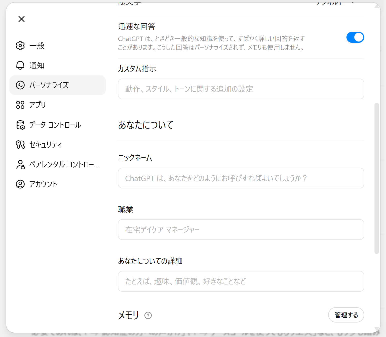 ・カスタム指示:返答のスタイルや動作に関する希望を書く欄