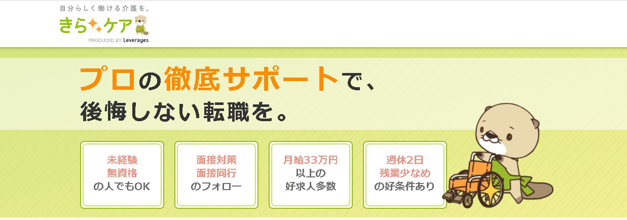 きらケアは無資格者や未経験者向けの求人を多く扱う転職サイトです。さらにきらケアで派遣登録すれば、介護の資格を無料で受講できる制度もあり、資格を武器に未経験業界でも早い段階でのキャリアアップが望めます。